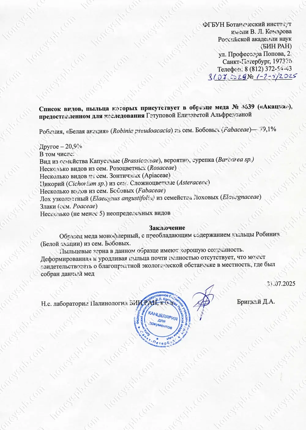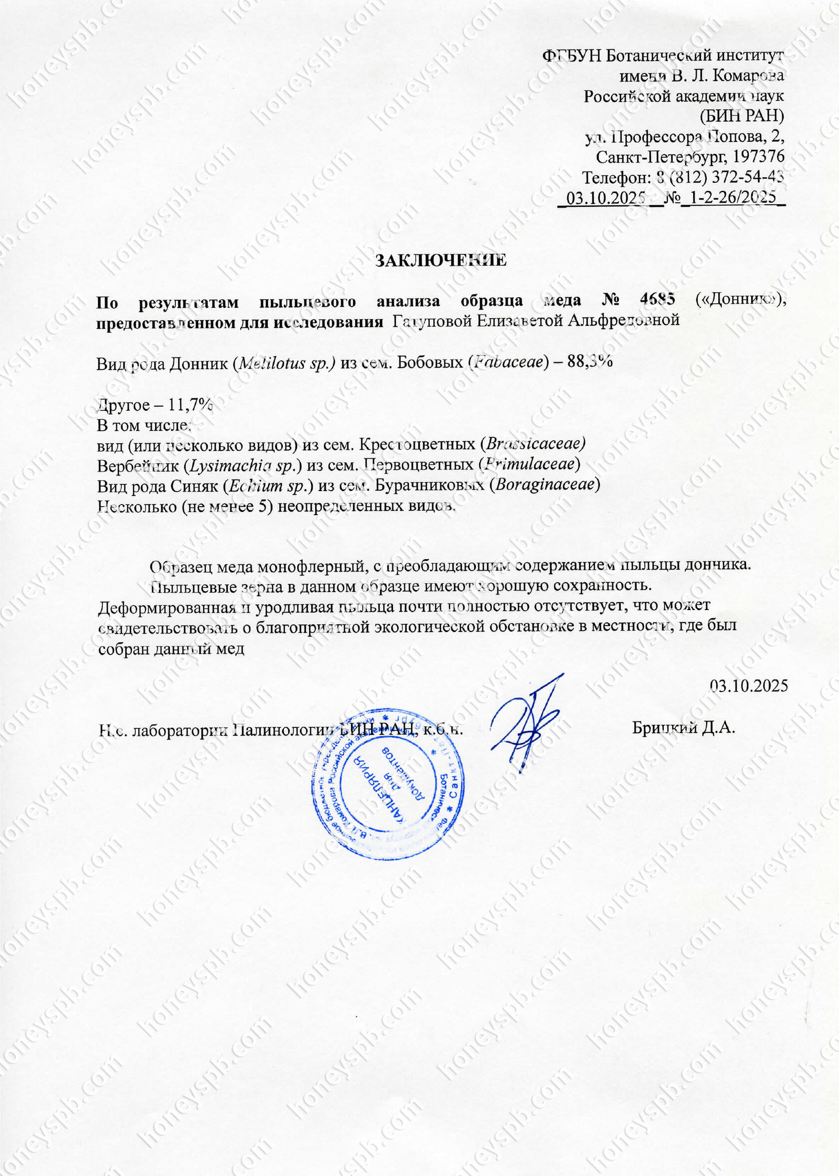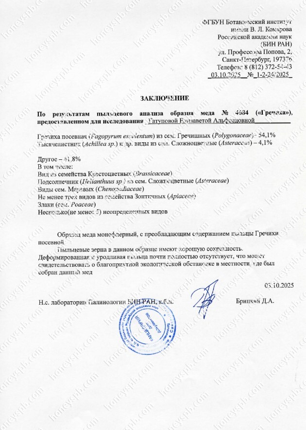 Пыльцевой анализ, который мы делаем – это дополнительный. Его можно сдавать, а можно не сдавать. Мы делаем его, в большей степени, для вашего спокойствия На данный момент, содержание 40-50% и более преобладающего медоноса относят к сортовому мёду. Например, пыльцы гречихи 50%, значит, мёд относят и называют "гречишным". Несмотря на то, что ещё 50% всякого разного намешали пчелы. Именно пыльцевой анализ позволяет узнать медоносную базу.